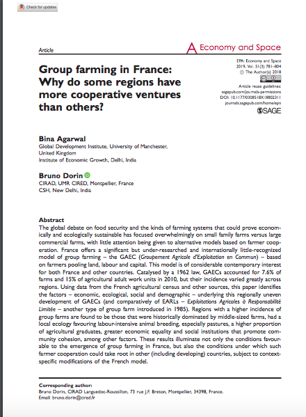 In Articles in Academic Journals 0 Agarwal, B., & Dorin, B. (2019). Group farming in France: Why do some regions have more cooperative ventures than others?. Environment and Planning A: Economy and Space, 51(3), 781-804.