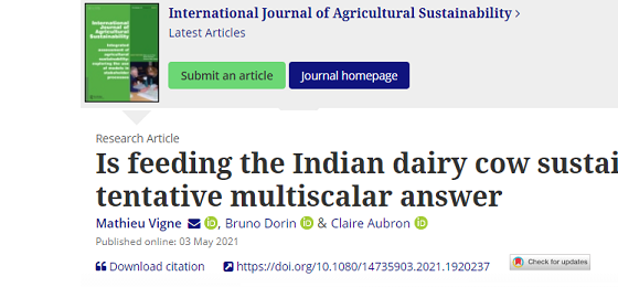 In Articles in Academic Journals 0 Vigne M., Dorin B., Aubron C., (2021), “Is feeding the Indian dairy cow sustainable?” International Journal of Sustainable Agriculture , (3 May 2021)