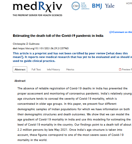 In Articles in Academic Journals 0 Guilmoto C., (2021), “Estimating the death toll of the Covid-19 pandemic in India” Medrxiv , (2 July 2021)
