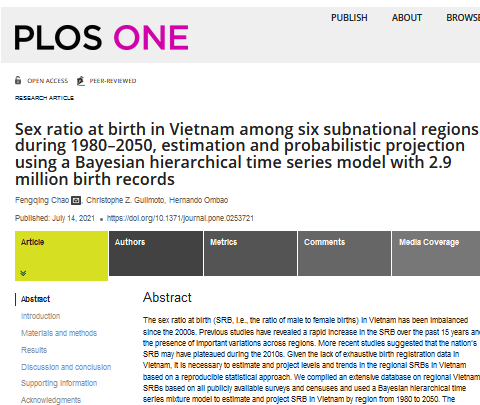 In Articles in Academic Journals 0 Guilmoto CZ., Chao F. and Ombao H. (2021), “Sex ratio at birth in Vietnam among six subnational regions during 1980–2050” PlOS ONE , (14 July 2021)
