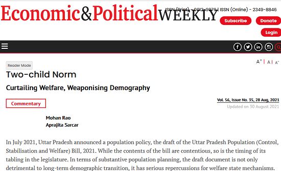 In Articles in Academic Journals 0 Rao Mohan, Sarcar Aprjita, (2021). Two-child Norm: Curtailing Welfare, Weaponising Demography, Economics & Political Weekly 56(35), 28 Aug 2021.
