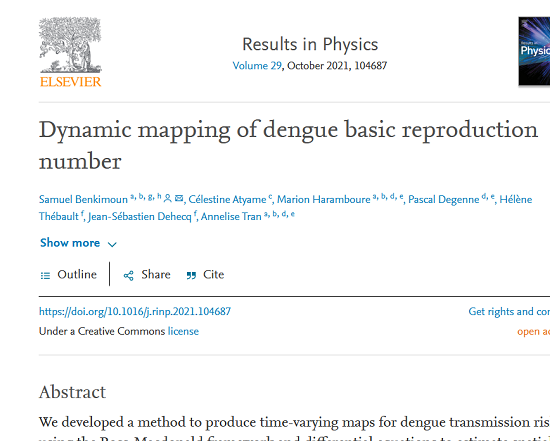 In Articles in Academic Journals 0 Benkimoun S., Atyame C., Haramboure M., Degenne P., Thébault H., Dehecq J.S. and Tran A. (2021). Dynamic mapping of dengue basic reproduction number, ELSEVIER, Vol. 36, October 2021.