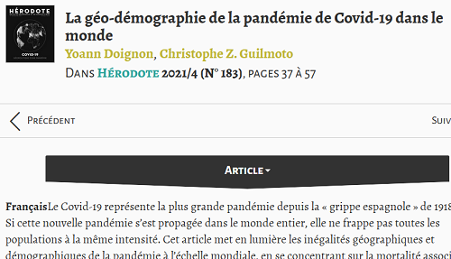 In Articles in Academic Journals 1 Doignon, Yoann, Guilmoto, Christophe, 2021. “La géo-démographie de la pandémie de Covid-19 dans le monde” Hérodote , 183(4), pp.37-57.