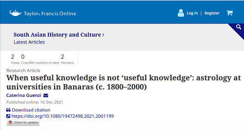 In Articles in Academic Journals 0 Guenzi, Caterina (2021), “When useful knowledge is not ‘useful knowledge’: astrology at universities in Banaras (c. 1800-2000” South Asian History and Culture ,