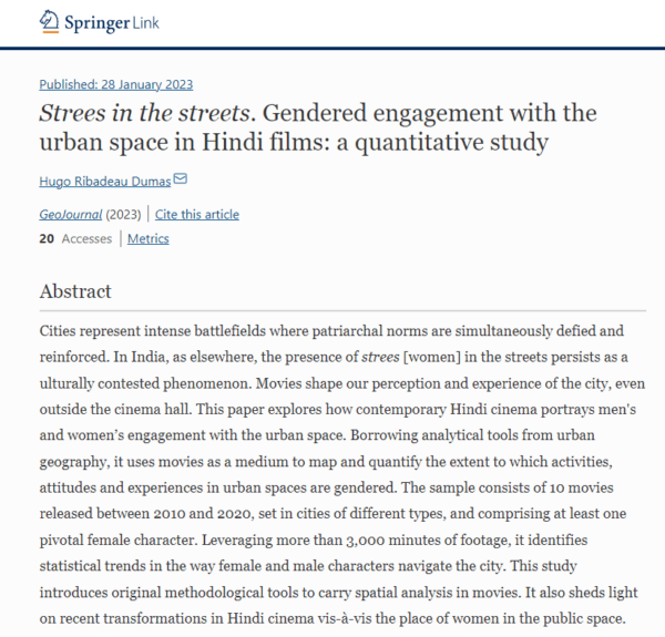 In Articles in Academic Journals 0 Ribadeau Dumas Hugo, 2023. “Strees in the streets. Gendered engagement with the urban space in Hindi films: a quantitative study”, GeoJournal.