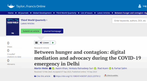 In Articles in Academic Journals 0 Webb, Martin, Aasim Khan, Venkata Ratnadeep Suri, Riad Azam, and Farhat Salim. 2023. “Between Hunger and Contagion: Digital Mediation and Advocacy during the COVID-19 Emergency in Delhi.” Third World Quarterly 1–17.