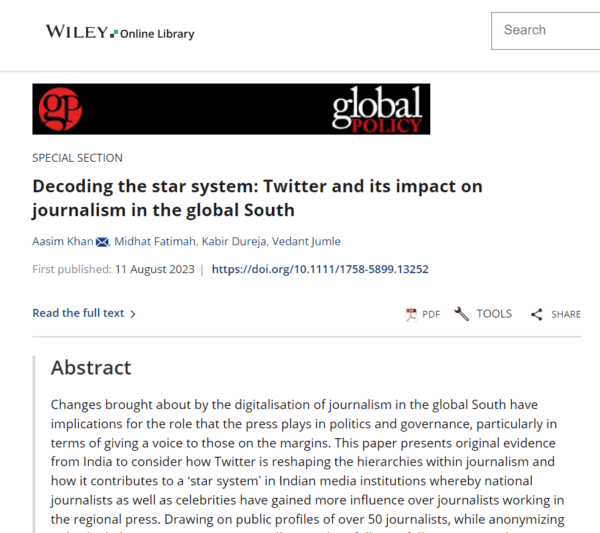 In Articles in Academic Journals 0 Khan, Aasim, Midhat Fatimah, Kabir Dureja, and Vedant Jumle. 2023. “Decoding the Star System: Twitter and Its Impact on Journalism in the Global South.” Global Policy 1758-5899.13252.