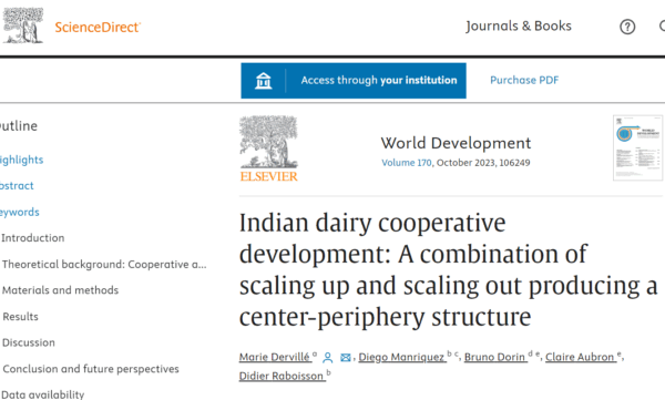 In Articles in Academic Journals 0 Dervillé, Marie, Diego Manriquez, Bruno Dorin, Claire Aubron, and Didier Raboisson. 2023. “Indian Dairy Cooperative Development: A Combination of Scaling up and Scaling out Producing a Center-Periphery Structure.” World Development, 170:106249.