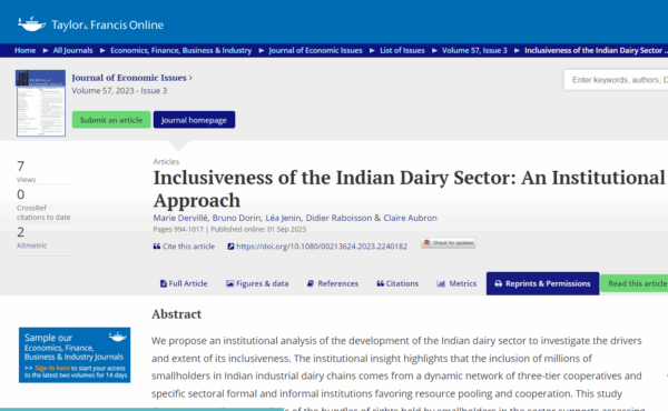 In Articles in Academic Journals 0 Dervillé, Marie, Bruno Dorin, Léa Jenin, Didier Raboisson, and Claire Aubron. 2023. “Inclusiveness of the Indian Dairy Sector: An Institutional Approach.” Journal of Economic Issues 57(3):994–1017