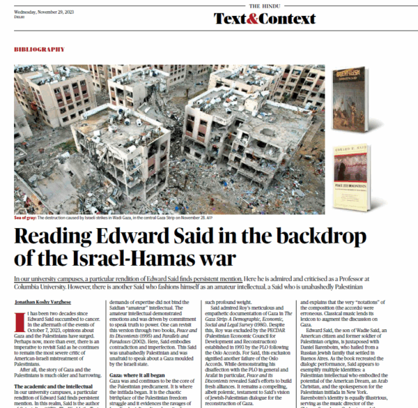 In Popular writing and other publications 0 Jonathan Koshy, 2023. “Reading Edward Said in the backdrop of the Israel-Hamas war”. The Hindu on 29 November.