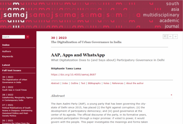 In Articles in Academic Journals 0 Tawa Lama , Stéphanie . 2023. “AAP, Apps and WhatsApp: What Digitalization Does to (and Says about) Participatory Governance in Delhi.” South Asia Multidisciplinary Academic Journal (30).