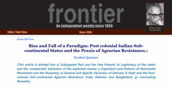 In Articles in Academic Journals 0 Quaiser, Neshat, 2024. “Rise and Fall of a Paradigm: Post colonial Indian Sub-continental States and the Praxis of Agrarian Resistance.” Frontier.