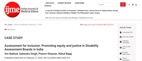 In Articles in Academic Journals 0 Rathod, Om., Singh, Satendra., Dhawan, Prannv., Bajaj, Rahul. 2025. “Assessment for inclusion: Promoting equity and justice in Disability Assessment Boards in India. Indian Journal of Medical Ethics.