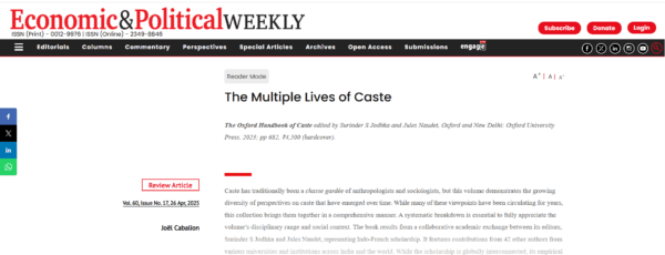 In Articles in Academic Journals 0 Cabalion, Joël . 2025. “The Multiple Lives of Caste.” Economic and Political Weekly.