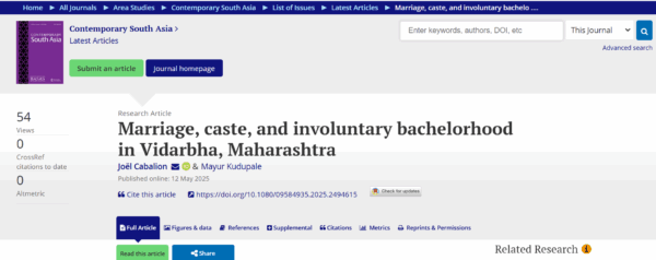 In Articles in Academic Journals 0 Cabalion, Joël., Mayur Kudupale 2025. “Marriage, Caste, and Involuntary Bachelorhood in Vidarbha, Maharashtra.” Contemporary South Asia.