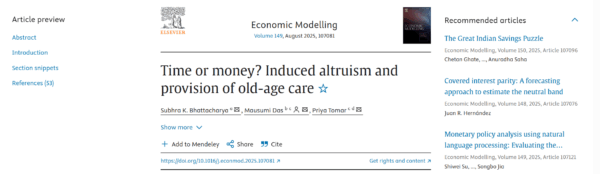 In Articles in Academic Journals 0 Bhattacharya, Subhra K., Mausumi Das, Priya Tomar 2025. “Time or money? Induced altruism and provision of old-age care.” Economic Modelling.