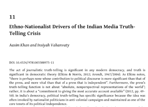 In Chapters in edited volumes 0 Khan, Aasim, and Insiyah Vahanvaty. 2023. “Ethno-Nationalist Drivers of the Indian Media Truth-Telling Crisis.” Pp. 196–218 in Re-thinking Mediations of Post-truth Politics and Trust. New York: Routledge.