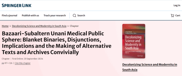 In Chapters in edited volumes 0 Quaiser, Neshat, 2024. “Bazaari-Subaltern Unani Medical Public Sphere: Blanket Binaries, Disjunctions, Implications and the Making of Alternative Texts and Archives Convivially.” Decolonizing Science and Modernity in South Asia.