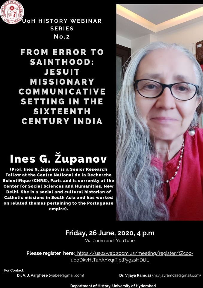 Part of the History webinars series conducted by the University of Hyderabad, this second edition will welcome Ines Županov from the CSH, on Friday 26 June 2020 at 4 p.m. She will give a lecture entitled “From Error to Sainthood: Jesuit Missionary Communicative Setting in the Sixteenth Century India”.