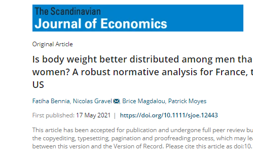In Articles in Academic Journals 0 Bennia F.,Gravel N., Magdalou B., Moyes P., (2021), “Is body weight better distributed among men than among women?” The Scandinavian Journal of Economics , (17 May 2021)