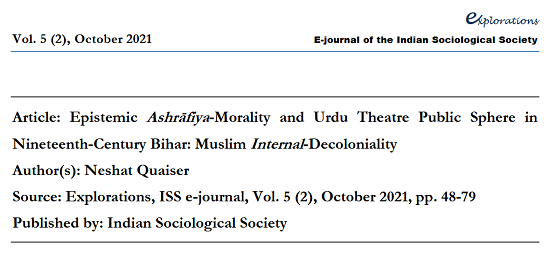 In Articles in Academic Journals 0 Quaiser, Neshat (2021), “Epistemic Ashrāfiya- Morality and Urdu Theatre Public Sphere in Nineteenth-Century Bihar: Muslim Internal-Decoloniality”, Explorations, Vol. 5(2)