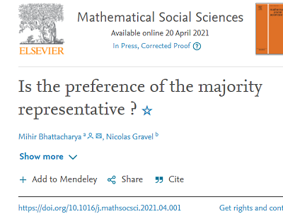 In Articles in Academic Journals 0 Bhattacharya M., Gravel N. , (2021) Is the preference of the majority representative? Mathematical Social Sciences (20 April 2021)