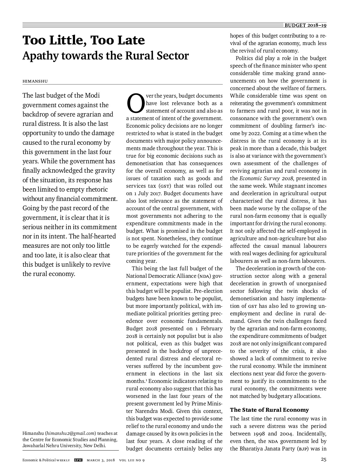 Ref: HIMANSHU, 2018. Too Little, Too Late. Apathy towards the Rural Sector. Economic & Political Weekly, vol. 53, n° 9, pp. 25-30.